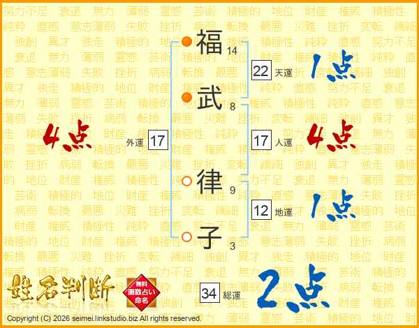 生活面を象徴する運勢です。外部から受ける影響力を表し、結婚運、家庭運や職場、環境への順応性を表します。総運から人運を引いた画数。姓や名が1文字の場合を除く。