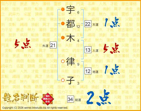 宇(6画)都(12画)木(4画) 律(9画)子(3画)