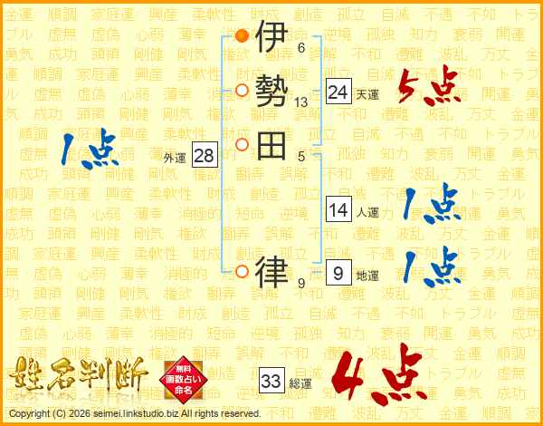 生活面を象徴する運勢です。外部から受ける影響力を表し、結婚運、家庭運や職場、環境への順応性を表します。総運から人運を引いた画数。姓や名が1文字の場合を除く。