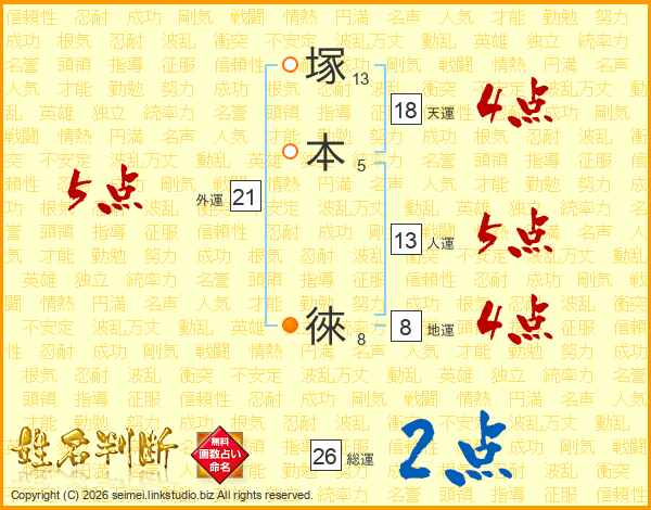 塚本徠さんの総運は26画の2点!