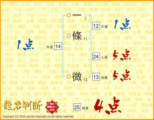 生活面を象徴する運勢です。外部から受ける影響力を表し、結婚運、家庭運や職場、環境への順応性を表します。総運から人運を引いた画数。姓や名が1文字の場合を除く。