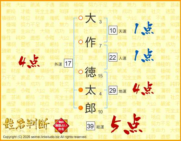 大作徳太郎さんの総運は39画の5点!