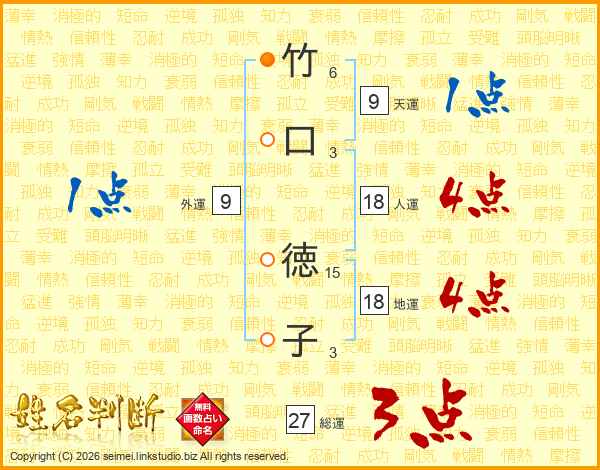 生活面を象徴する運勢です。外部から受ける影響力を表し、結婚運、家庭運や職場、環境への順応性を表します。総運から人運を引いた画数。姓や名が1文字の場合を除く。