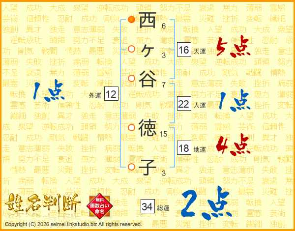 西ヶ谷徳子さんの総運は34画の2点!