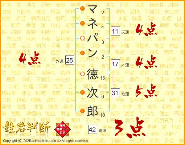 マ(2画)ネ(4画)パ(3画)ン(2画) 徳(15画)次(6画)郎(10画)