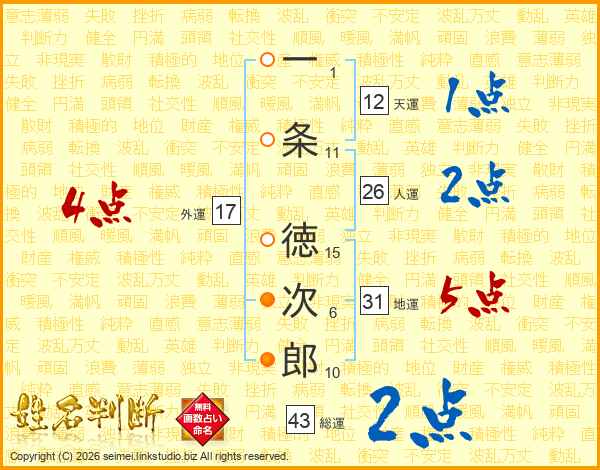 一(1画)条(11画) 徳(15画)次(6画)郎(10画)
