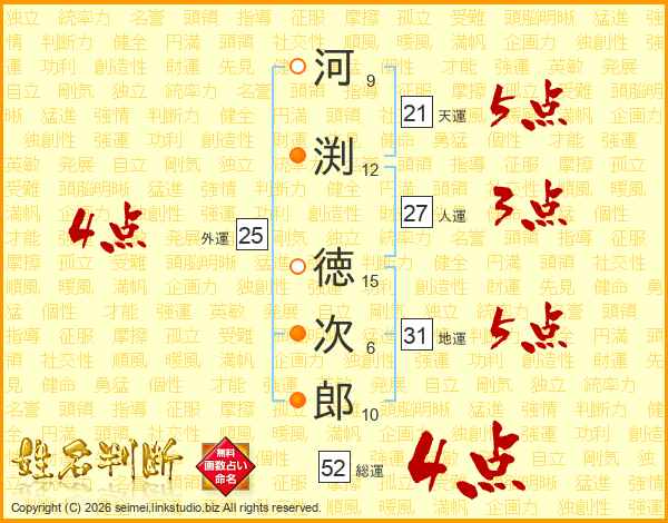 河(9画)渕(12画) 徳(15画)次(6画)郎(10画)