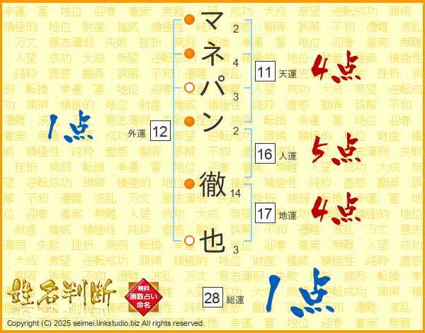 マ(2画)ネ(4画)パ(3画)ン(2画) 徹(14画)也(3画)