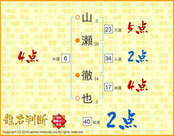 山(3画)瀬(20画) 徹(14画)也(3画)