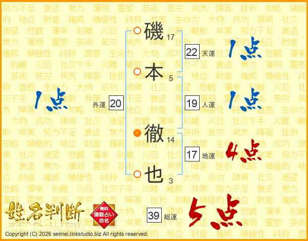 生活面を象徴する運勢です。外部から受ける影響力を表し、結婚運、家庭運や職場、環境への順応性を表します。総運から人運を引いた画数。姓や名が1文字の場合を除く。