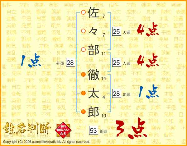 佐(7画)々(7画)部(11画) 徹(14画)太(4画)郎(10画)