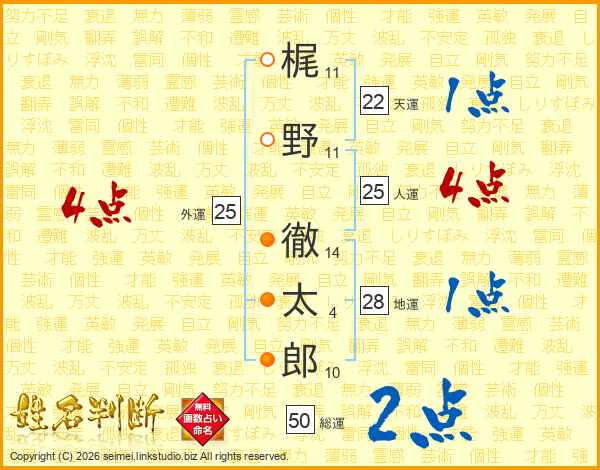 梶(11画)野(11画) 徹(14画)太(4画)郎(10画)