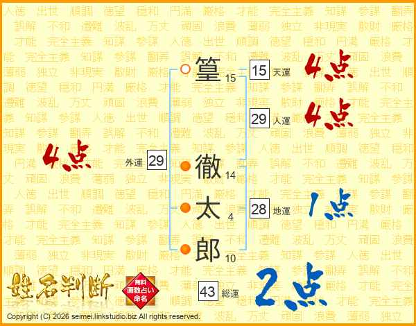 篁徹太郎さんの総運は43画の2点!