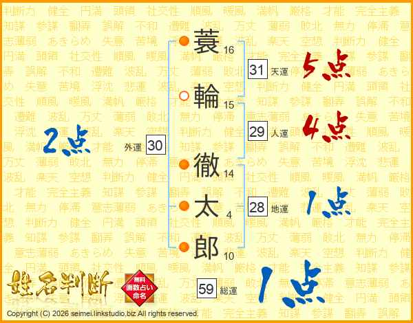 蓑(16画)輪(15画) 徹(14画)太(4画)郎(10画)