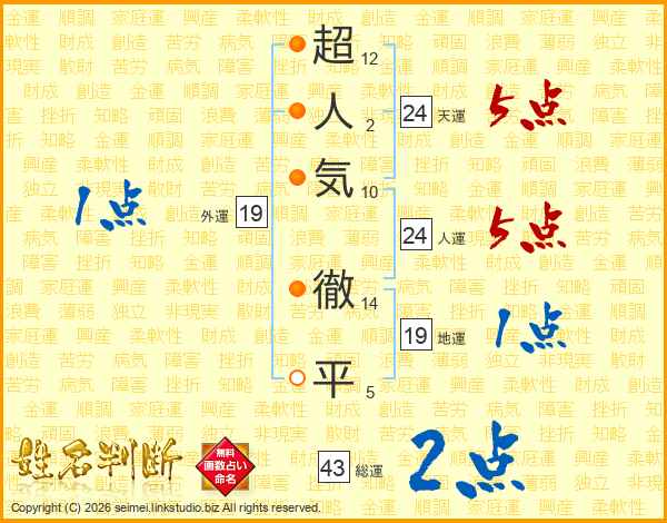 超(12画)人(2画)気(10画) 徹(14画)平(5画)
