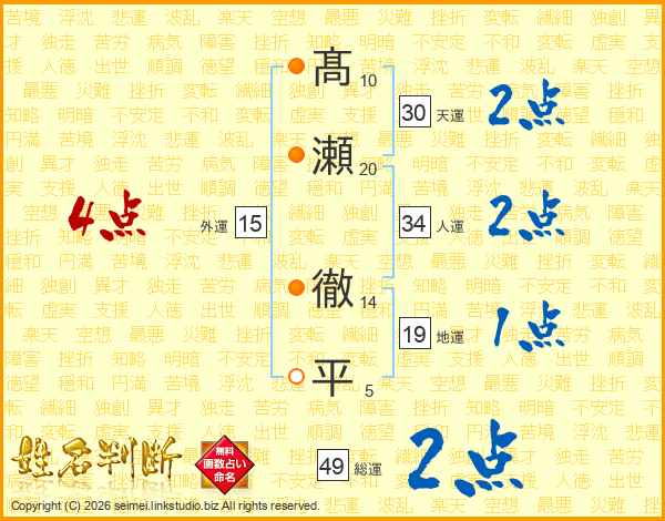 髙(10画)瀬(20画) 徹(14画)平(5画)