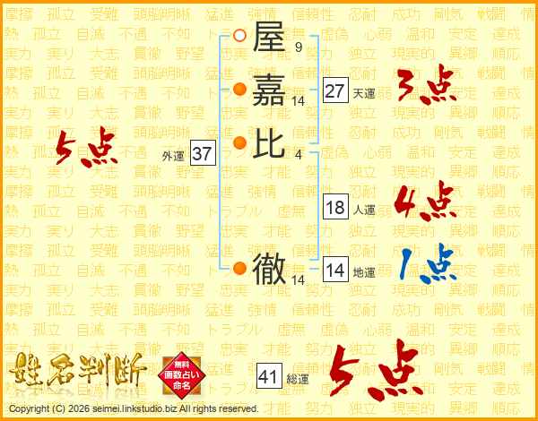 屋(9画)嘉(14画)比(4画) 徹(14画)