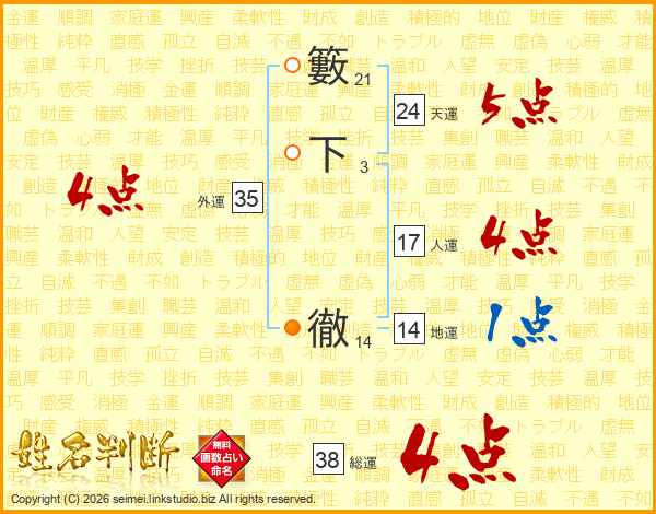 籔下徹さんの総運は38画の4点!