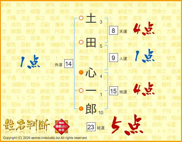 土(3画)田(5画) 心(4画)一(1画)郎(10画)