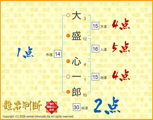 大(3画)盛(12画) 心(4画)一(1画)郎(10画)