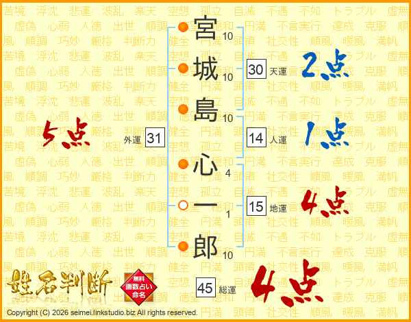 宮(10画)城(10画)島(10画) 心(4画)一(1画)郎(10画)