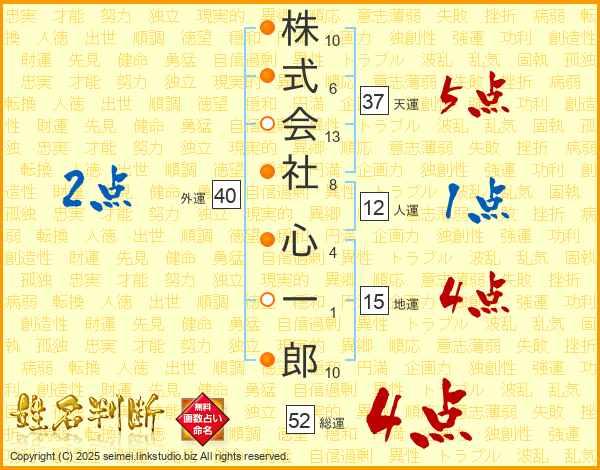 株(10画)式(6画)会(13画)社(8画) 心(4画)一(1画)郎(10画)