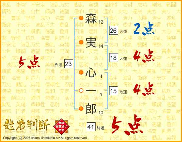森(12画)実(14画) 心(4画)一(1画)郎(10画)