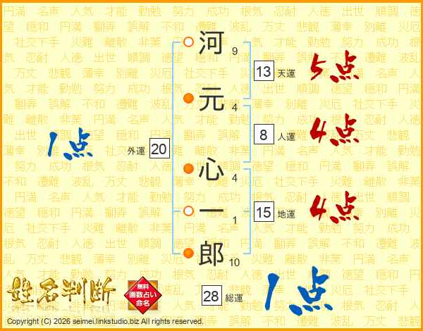 河(9画)元(4画) 心(4画)一(1画)郎(10画)