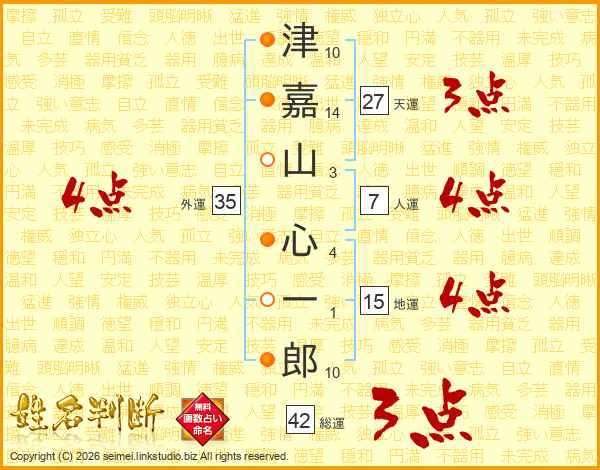 津(10画)嘉(14画)山(3画) 心(4画)一(1画)郎(10画)