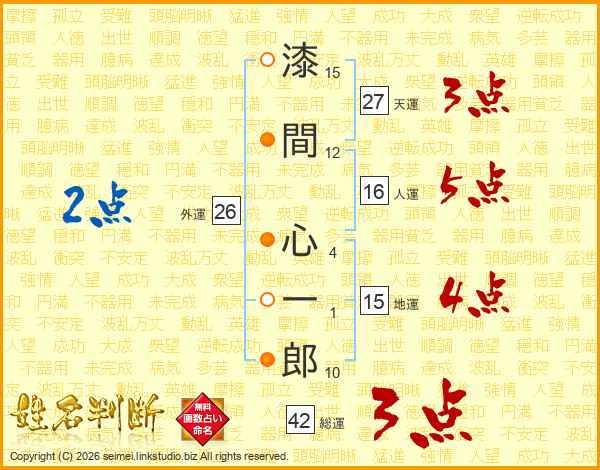 漆(15画)間(12画) 心(4画)一(1画)郎(10画)