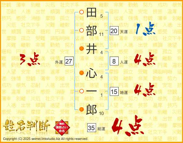 田(5画)部(11画)井(4画) 心(4画)一(1画)郎(10画)