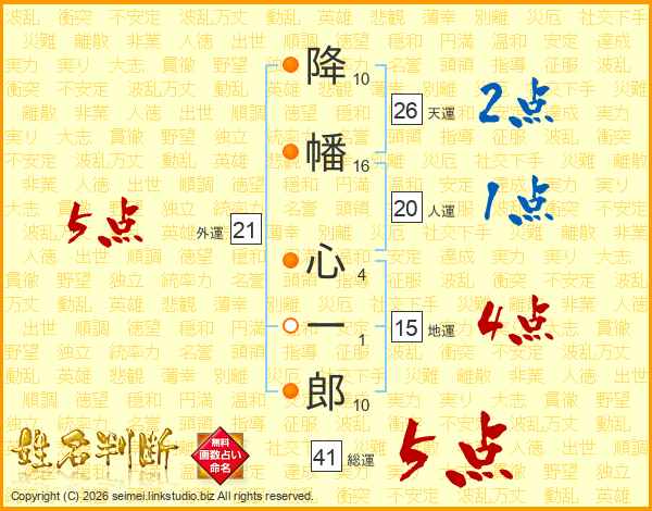 降(10画)幡(16画) 心(4画)一(1画)郎(10画)