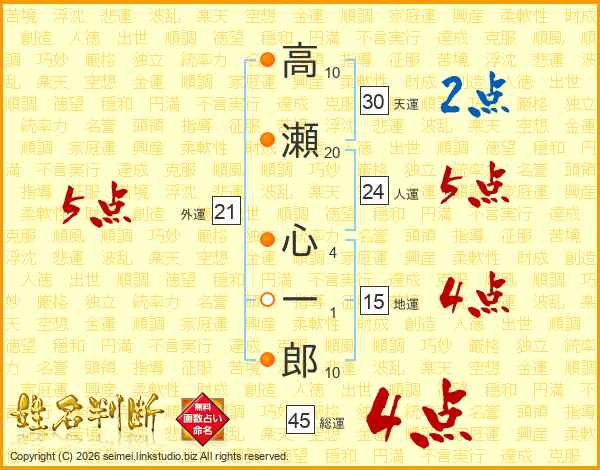 高瀬心一郎さんの総運は45画の4点!