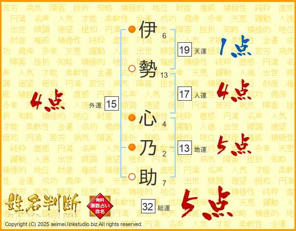 伊(6画)勢(13画) 心(4画)乃(2画)助(7画)