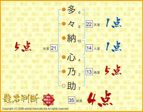 多(6画)々(6画)納(10画) 心(4画)乃(2画)助(7画)