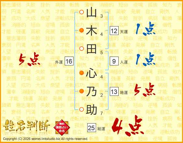 山木田心乃助さんの総運は25画の4点!