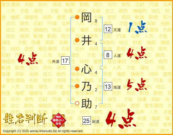 岡(8画)井(4画) 心(4画)乃(2画)助(7画)