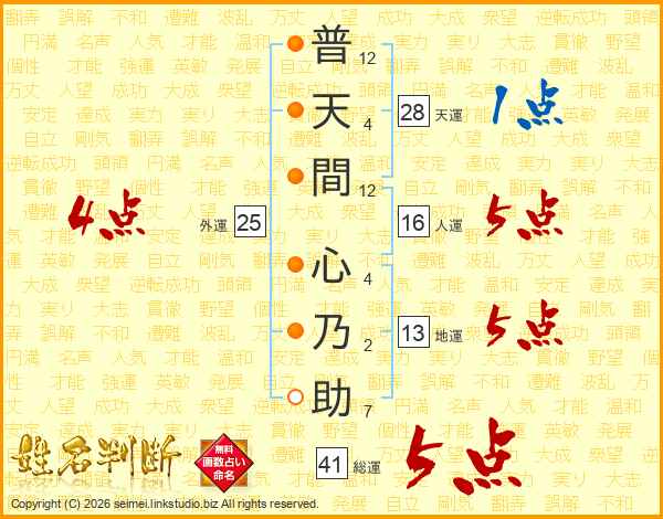 普(12画)天(4画)間(12画) 心(4画)乃(2画)助(7画)