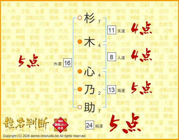 杉(7画)木(4画) 心(4画)乃(2画)助(7画)