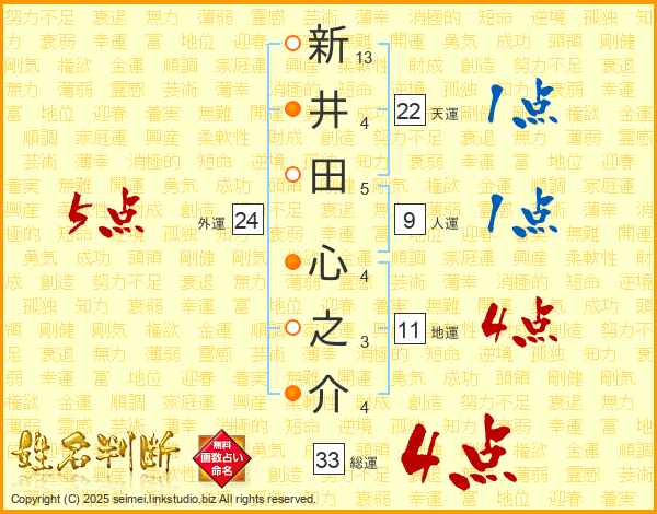 新(13画)井(4画)田(5画) 心(4画)之(3画)介(4画)