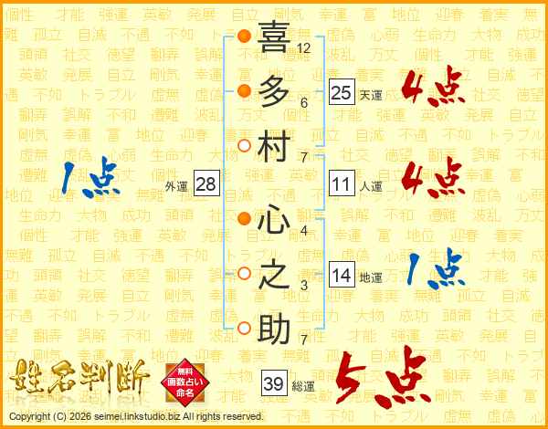 喜多村心之助さんの総運は39画の5点!