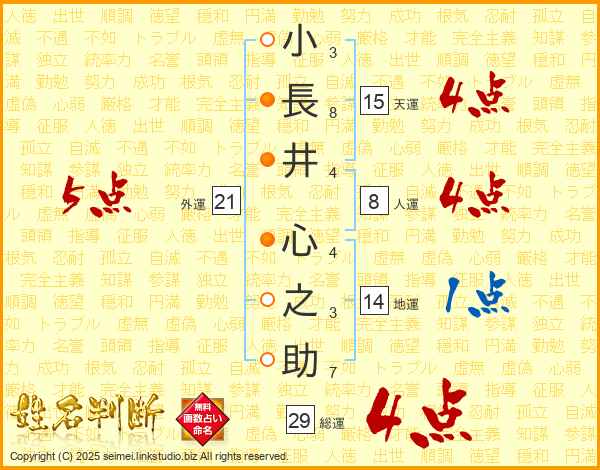 小(3画)長(8画)井(4画) 心(4画)之(3画)助(7画)