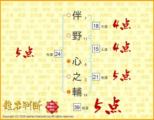 伴野心之輔さんの総運は39画の5点!