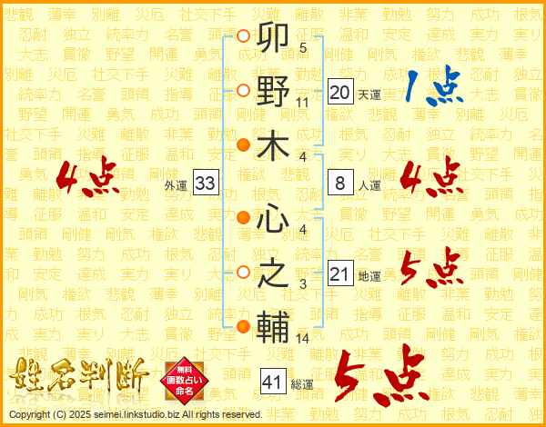 卯野木心之輔さんの総運は41画の5点!