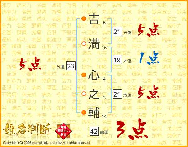 吉(6画)満(15画) 心(4画)之(3画)輔(14画)