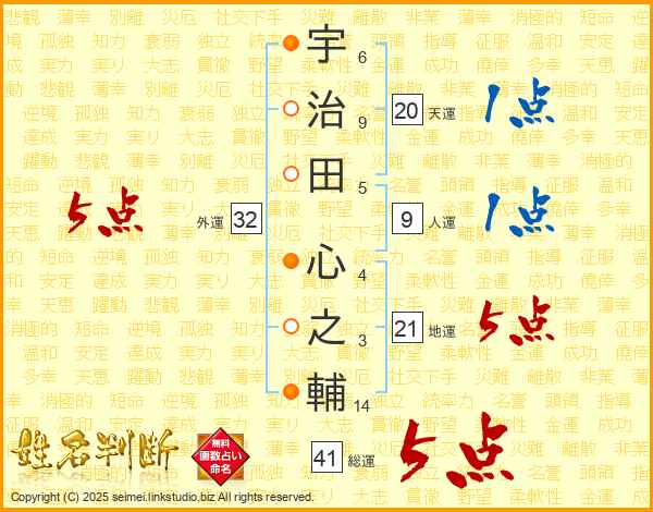 宇(6画)治(9画)田(5画) 心(4画)之(3画)輔(14画)