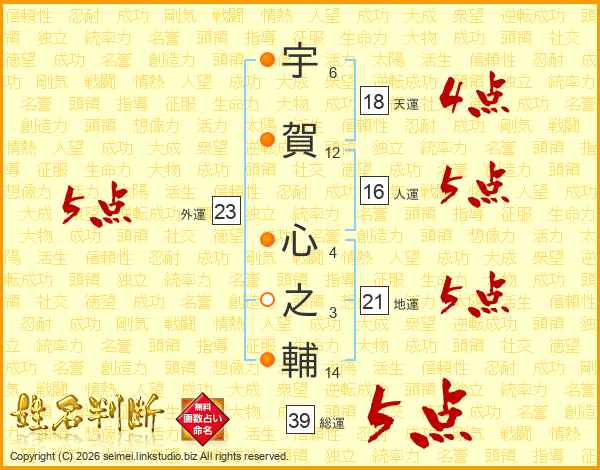 宇賀心之輔さんの総運は39画の5点!