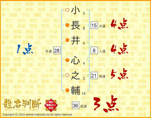 小(3画)長(8画)井(4画) 心(4画)之(3画)輔(14画)