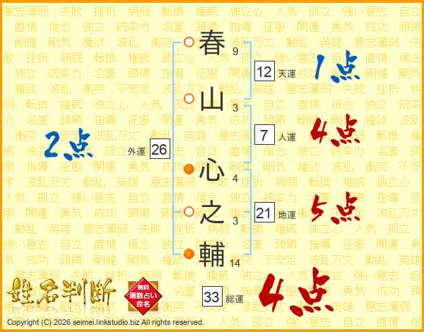 春(9画)山(3画) 心(4画)之(3画)輔(14画)