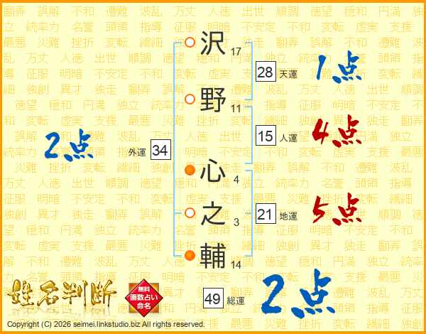 沢(17画)野(11画) 心(4画)之(3画)輔(14画)